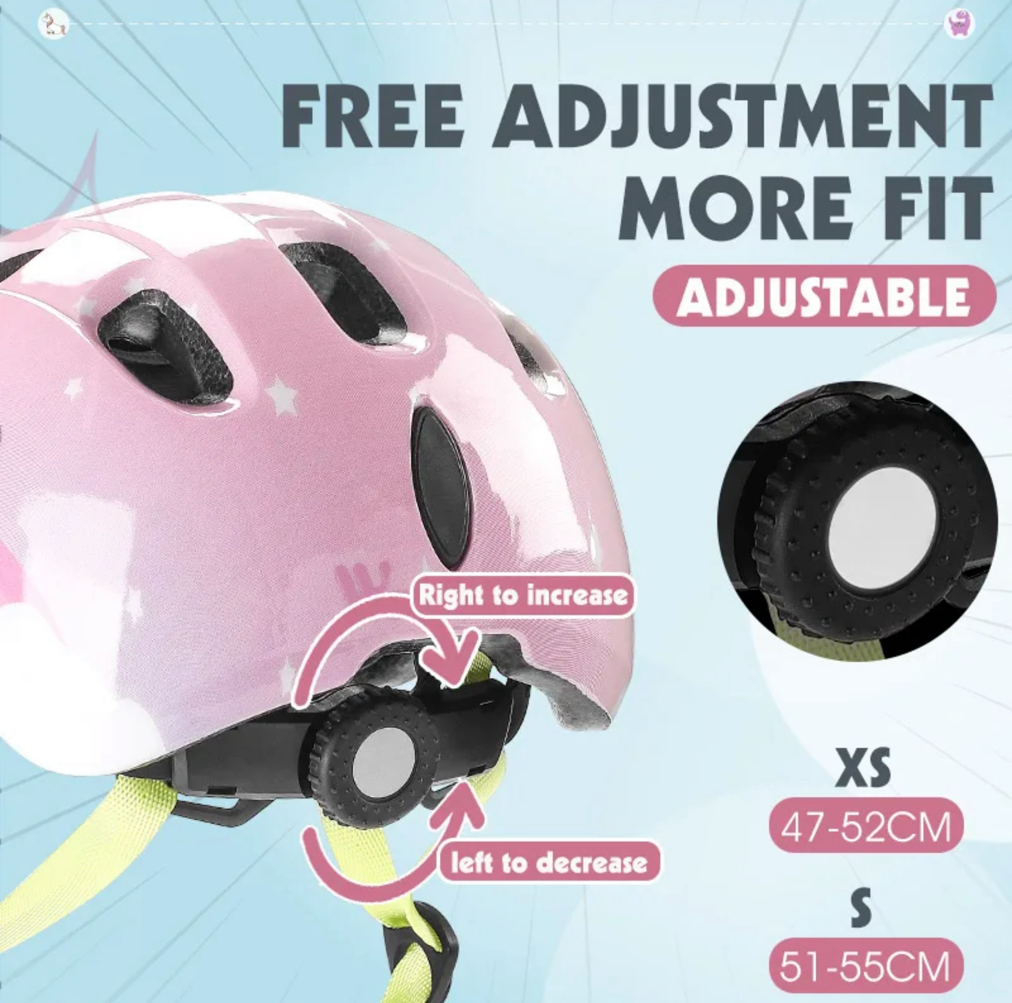 - kask w rozmiarze dziecięcym na obwód głowy : XS 47-52cm / S 51-55cm
