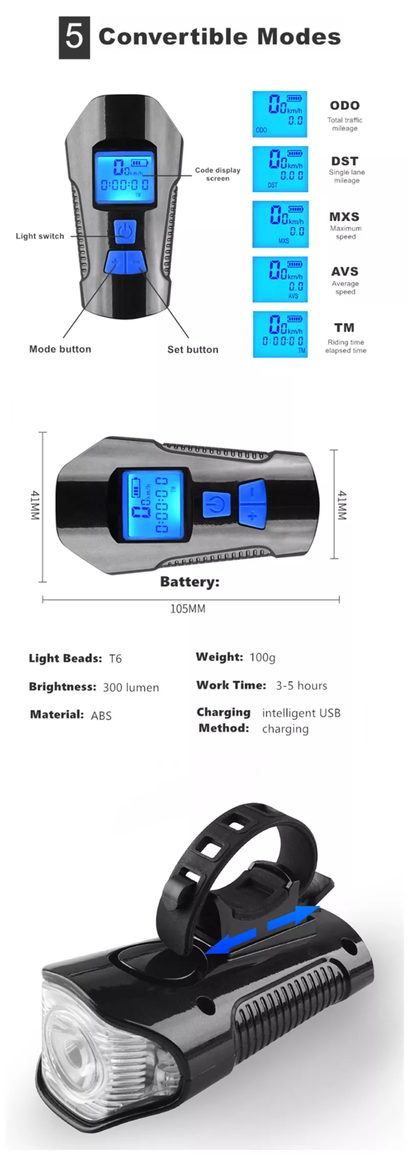 ODO to całkowity przebieg, DST to jednokierunkowe kilometry, MAS to najwyższa prędkość, AVS to średnia prędkość, TM to czas jazdy, I może być wyposażony w mobilny powerbank dla ciągłej wytrzymałości